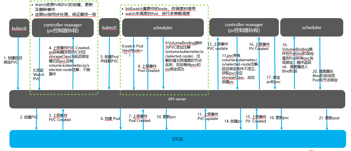 - Pvc controller将pvc和pv绑定。正常情况下,kube-schedule绑定pod和node时候,如果pod有pvc,会等待pvc和pv绑定完成后根据pv所在的az选择node过滤一部分不满足节点,然后再完成绑定pod和node。延迟绑定场景,kube-schedule 先不等待PVC和PV绑定,先预调度node,然后把预调度结果写到PVC注解中,pvc控制接获取到预调度az信息后,再完成pv创建和pv绑定。所以,延迟绑定时延迟了pvc和pv绑定阶段。