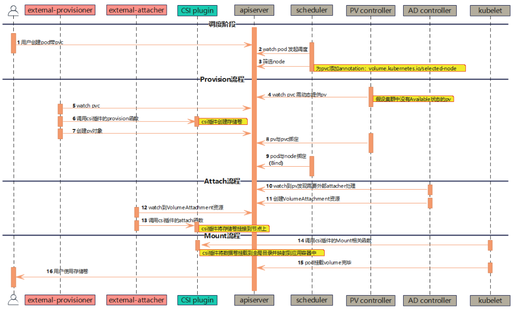 以块类型存储为例,从声明pvc到pod挂载卷成功时序图: