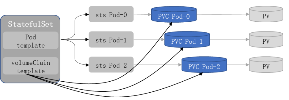 其中StatefulSet关联的pod与pvc、pv的关系如下图: