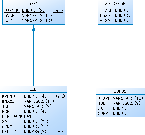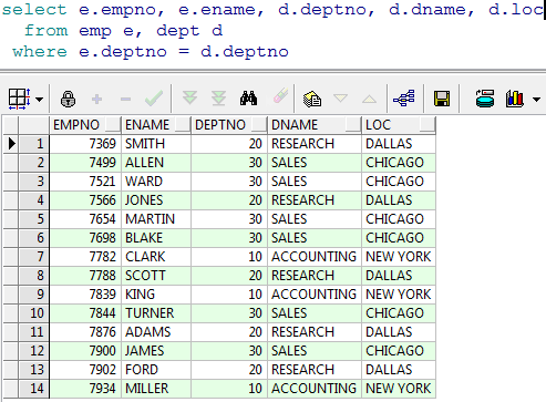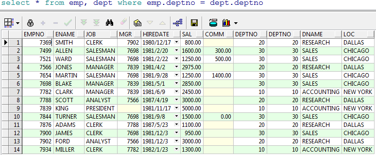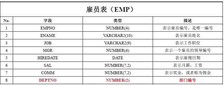 在两张表中我们发现有一个共同的字段是 depno,depno 就是两张表的关联的字段,我们可以使用这个字段来做限制条件,两张表的关联查询字段一般是其中一张表的主键,另一张表的 外键。