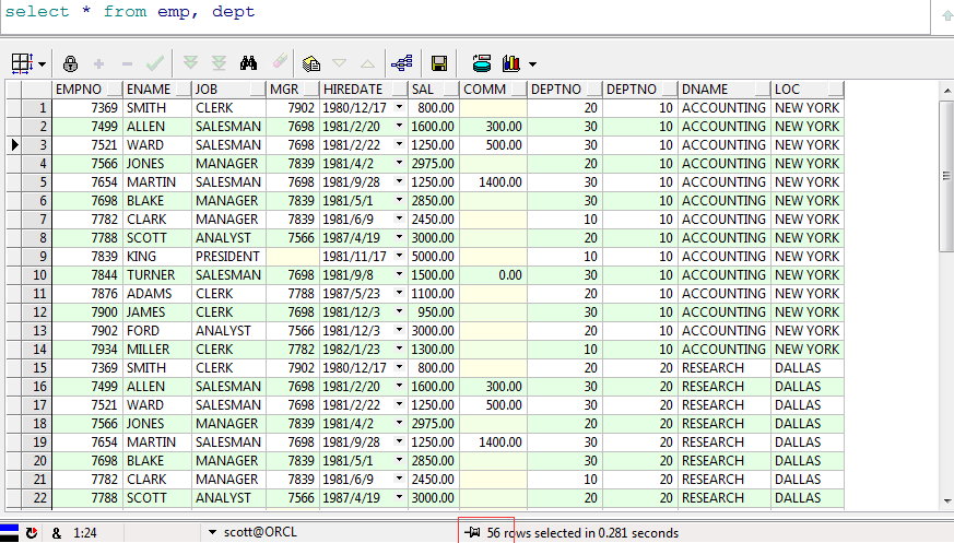 我们发现产生的记录数是 56 条,我们还会发现emp 表是 14 条,dept 表是 4 条,56 正是emp