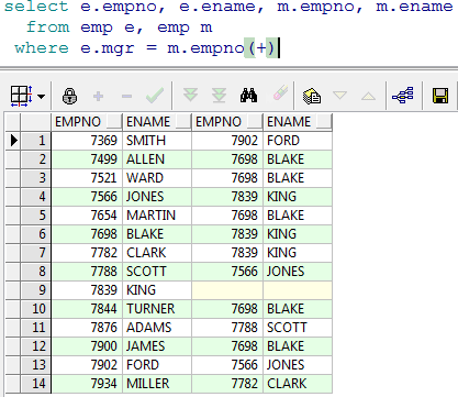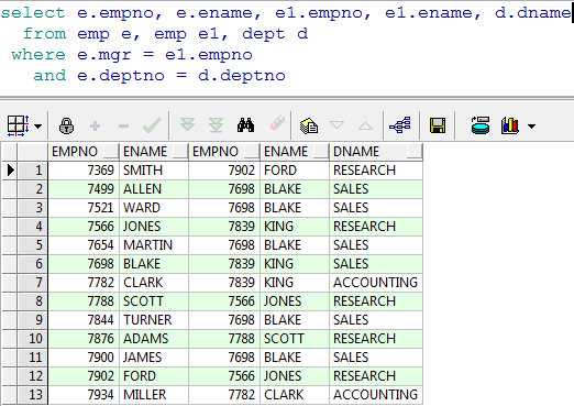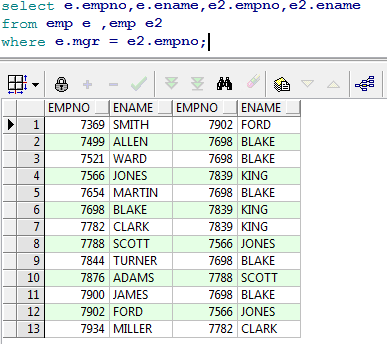 分析:emp 表中的 mgr 字段是当前雇员的上级领导的编号,所以该字段对 emp 表产生了自身关联,可以使用 mgr 字段和 empno 来关联