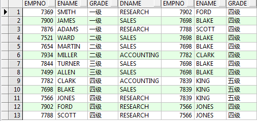 范例:查询出每个员工编号,姓名,部门名称,工资等级和他的上级领导的姓名,工资等级select e.empno,