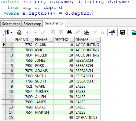 使用(+)表示左连接或者右连接,当(+)在左边表的关联条件字段上时是左连接,如果是在右 边表的关联条件字段上就是右连接。