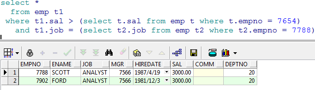 范例:查询出比雇员 7654 的工资高,同时从事和 7788 的工作一样的员工