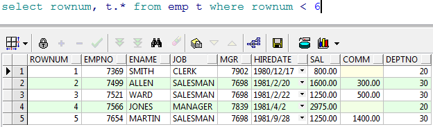 我们可以根据 rownum 来取结果集的前几行,比如前 5 行