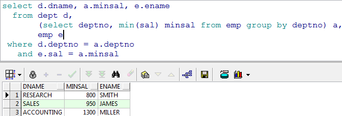 范例:要求查询每个部门的最低工资和最低工资的雇员和部门名称