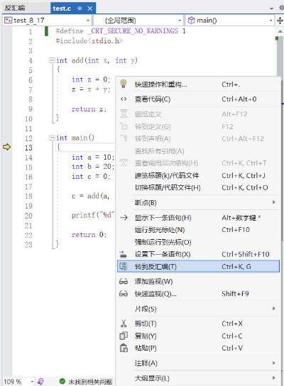 我们完成上述代码后,按 F10 进行调试,然后鼠标右键单击 “转到反汇编”,然后我们就可以看到反汇编代码了