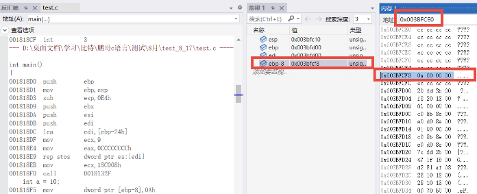 我们可以成功的观察到,在 edp-8 这个位置,已经存放了 a=10,其余位置的 cccccccc 还是保留不变,这也就解释了平常随机值的大小为 cccccccc 的情况