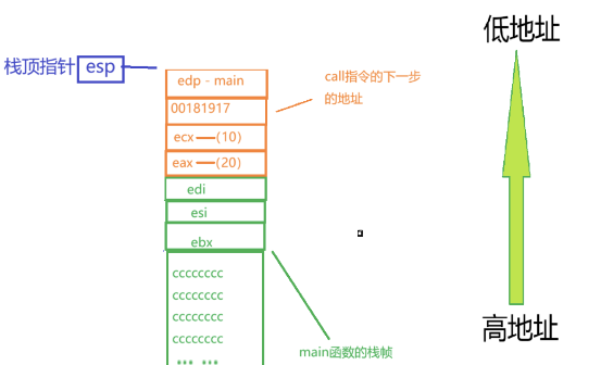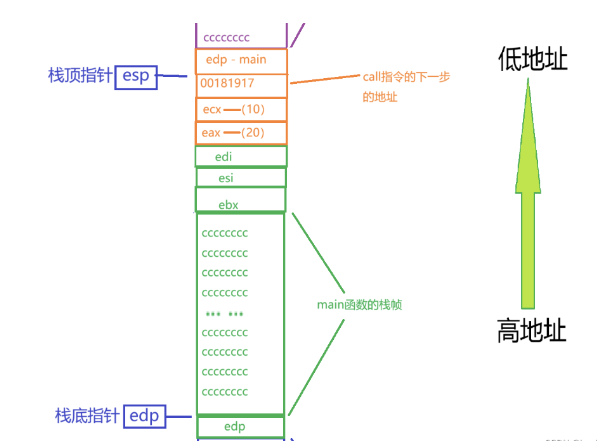 此时的栈顶指针,栈底指针就可以做到重新维护 main 函数的栈帧空间,因为之前 call 指令留下的地址,我们就可以做到 “出去又可以回来” 这对于我们管理空间是非常高效稳定的+
