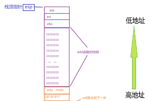 栈是从高地址向低地址延伸,一个函数的栈帧用 ebp 和 esp 这两个寄存器来划定范围.ebp 指向当前的栈帧的底部,esp 始终指向栈帧的顶部;