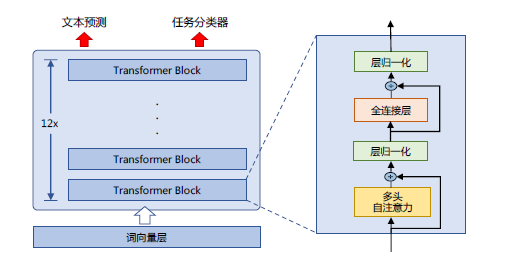 OpenAI 公司在2018 年提出的生成式预训练语言模型(Generative Pre-Training,GPT)是典型的生成式预训练语言模型之一。GPT 模型结构如图2.3所示,由多层Transformer 组成的单向语言模型,主要分为输入层,编码层和输出层三部分。