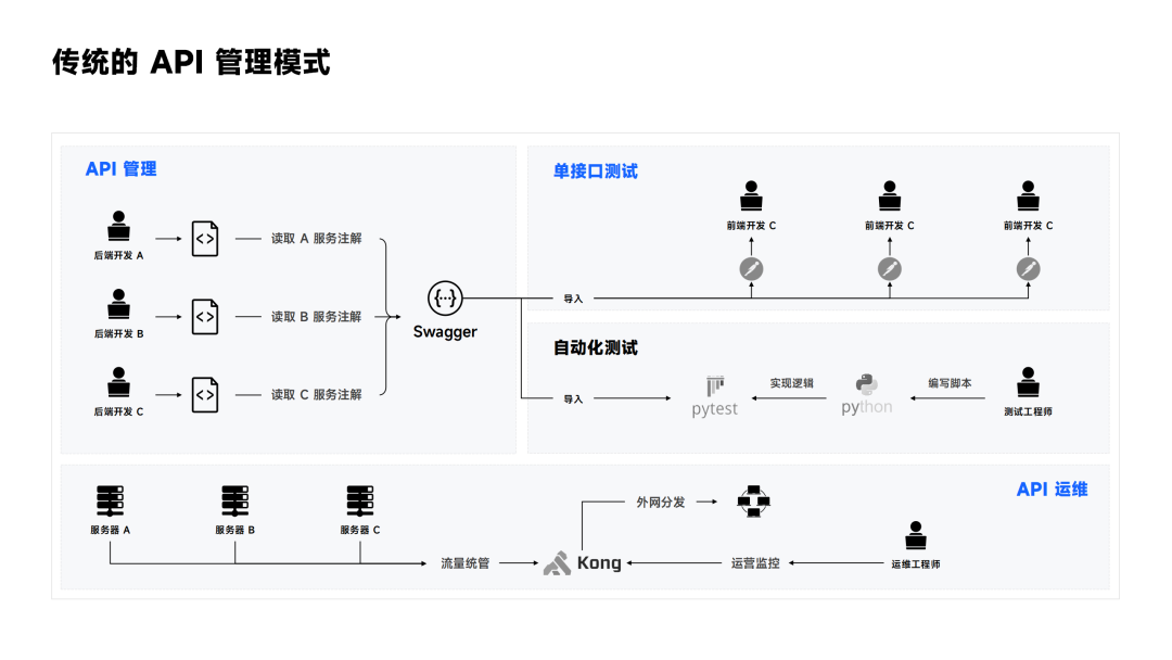 在传统的模式中,API 管理的各大模块之间往往是相互割裂的,不同的模块由不同的岗位人员使用不同的工具来进行管理,模块与模块之间的信息更依赖团队间的线下沟通进行传递,而且整体管理流程也同样是依赖人工干涉,API 管理的成本较高。