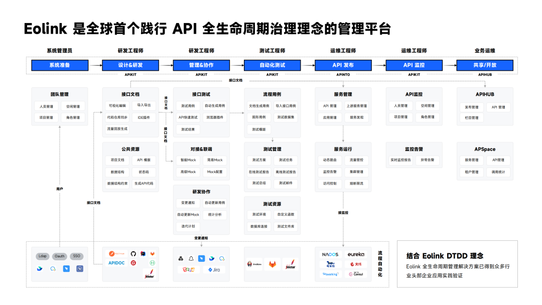 基于此,Eolink 提出了 API 全生命周期管理的解决方案,旨在一个平台上集成了API 的设计、开发、测试以及共享等所有环节,以促进研测自动化的构建。