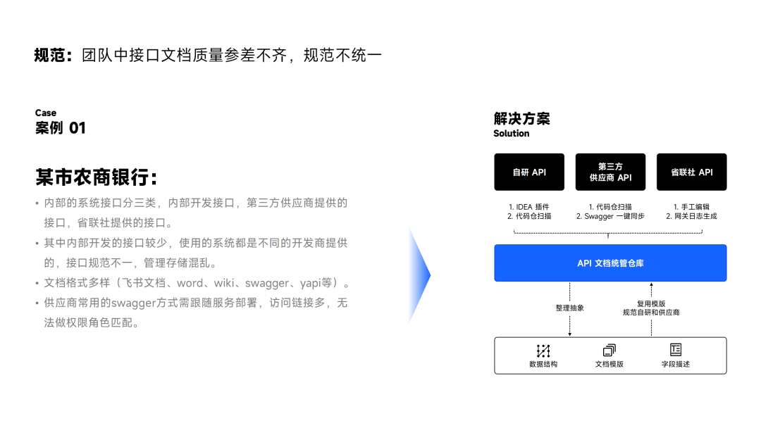 首先是规范性的问题。我们曾服务过一家农商银行,银行其内部接口众多,主要分为三类:包括自研接口、外包供应商开发的接口以及上级机构需要调用的通用接口。****