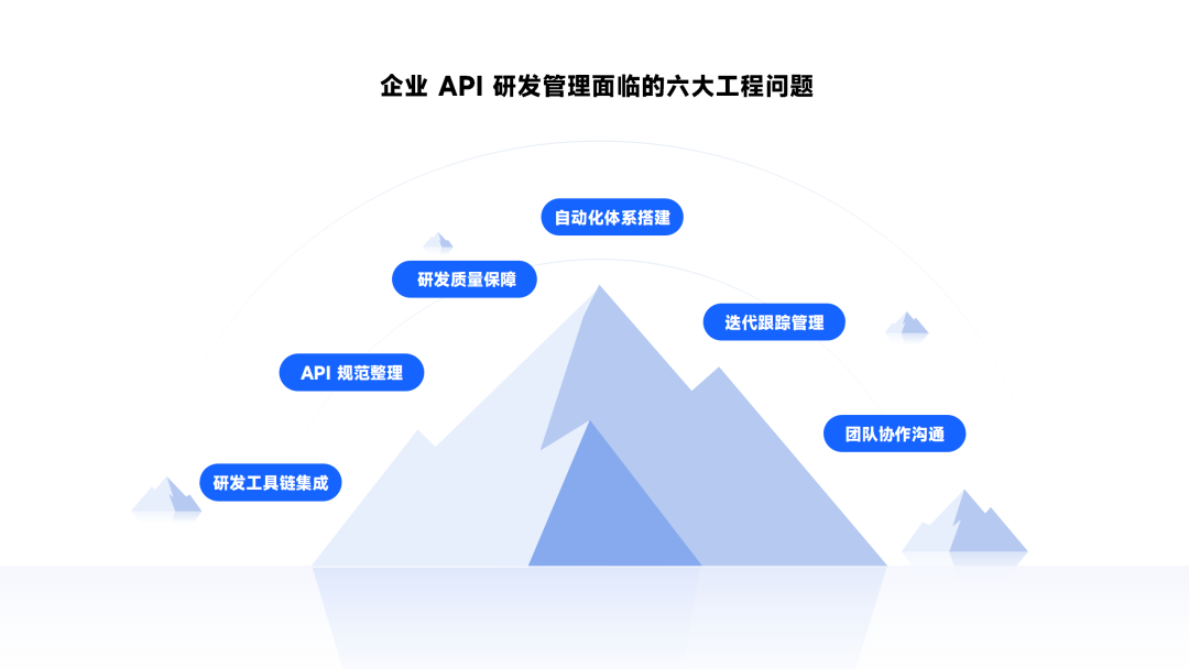 Eolink 在服务了超过 10 万家企业的实践中,我们总结了六大工程问题:研发工具链的集成、API 规范的整理、研发质量的保障、自动化体系的搭建、迭代跟踪管理、以及团队协作沟通。
