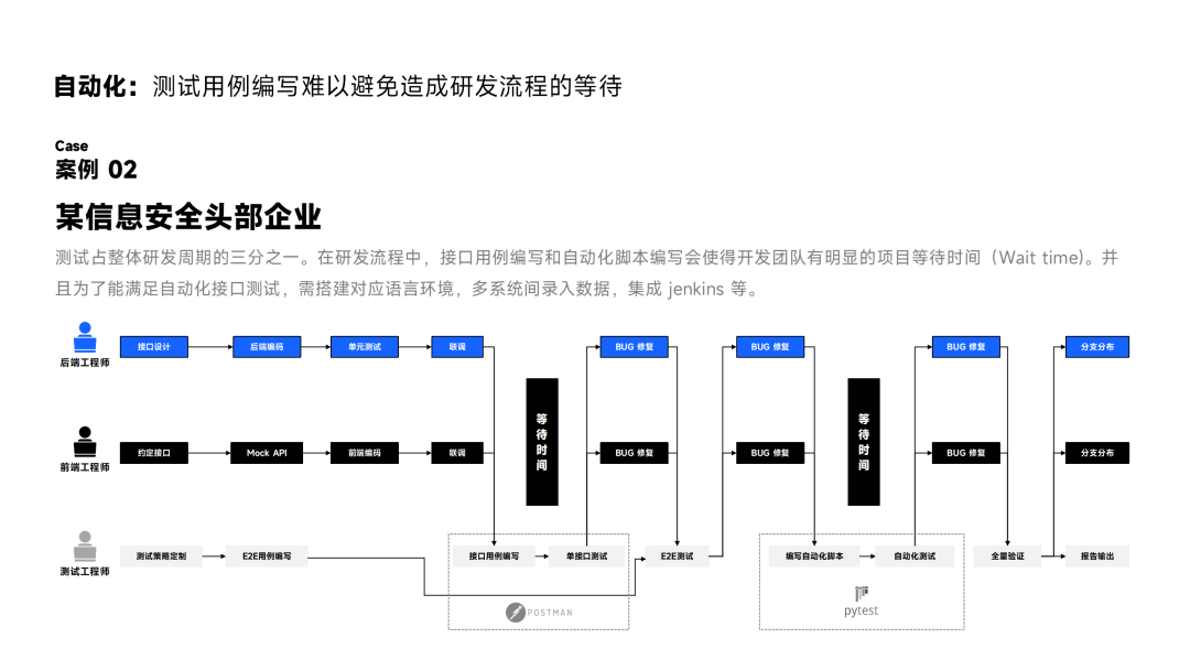 如某信息安全部门,该部门的测试任务比较多,他们发现测试同事经常忙于编写测试用例或脚本,导致整个研发流程等待时间较长,甚至使测试时间占据整体项目交付时间的三分之一。