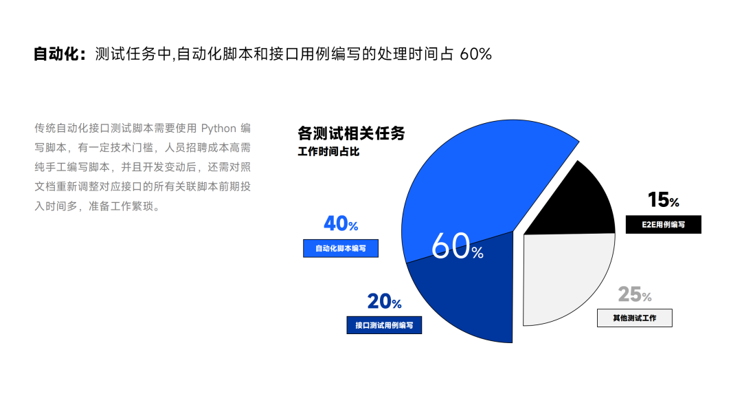 在我们更进一步的分析发现,在这些测试时间中,约有 60% 的时间是花在编写接口用例和规划测试脚本上。因此,我们首要的目标是解决这 60% 时间浪费的问题。