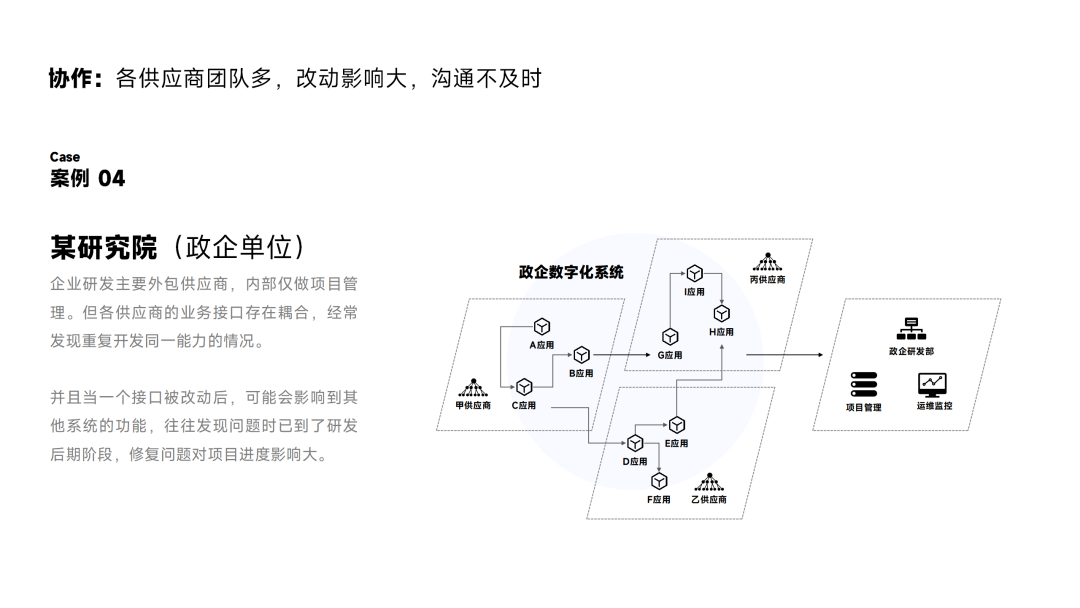 此外,当团队庞大时,沟通协作也可能成为一个问题。例如一些政企单位更多的会依赖外包供应商为其提供业务系统和服务,不同的项目由不同的服务商去负责,系统较多往往会导致单位内部各系统间接口的依赖关系更重。