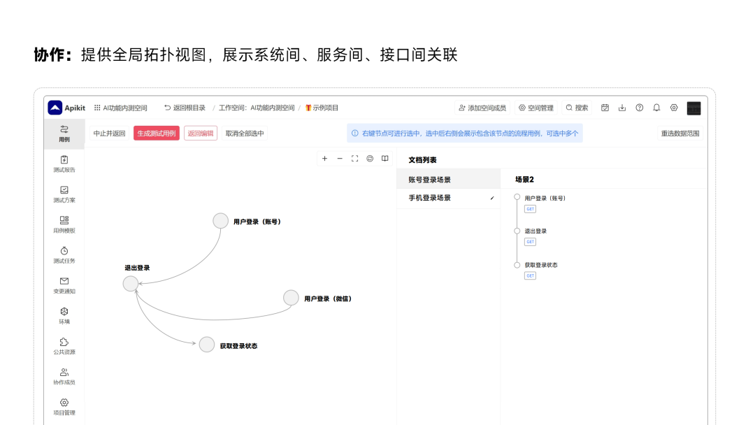 针对这些链路相关的风险问题和沟通难题,Eolink 同样也提供了解决方案,即基于 API 关系的可视化管理。Eolink 平台提供了可以根据 API 调用的链路,自动化测试用例以及根据 API 文档中的入参和出参的关系生成 API 拓扑图的能力。