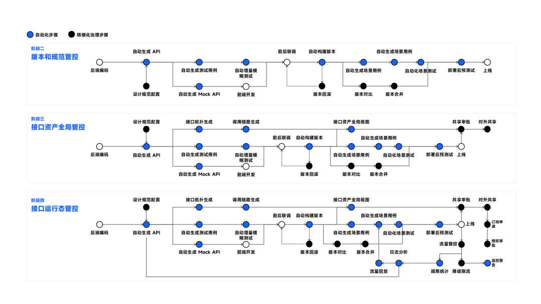 因此,我们需要分析现有流程,为企业规划不同阶段的改造路线。 最先要优化和实现自动化的是那些投入产出比最高的环节。其次是进行版本和规范的管控,使数据更加标准,以便在下一步进行拓展。然后就可以对接口资产进行全局管控,最后再进行与生产相关的接口运行态的管控。这就是整体解决流程变更阻力的一种可行的途径。