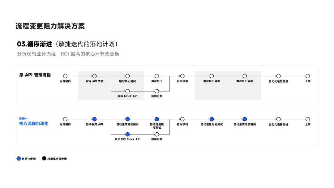 另外就是,推动 DevOps 和 API 全生命周期的实践更多的是为了实现企业内部各个流程的自动化。