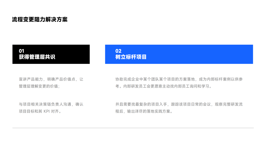 面对这些流程变更的阻力,首先,我们必须与各级别领导进行充分的沟通。 我们需要向他们解释项目的价值点,并与项目的决策链负责人对接,确保项目目标与其 KPI 一致,这样才能从上到下获得更多资源的支持。