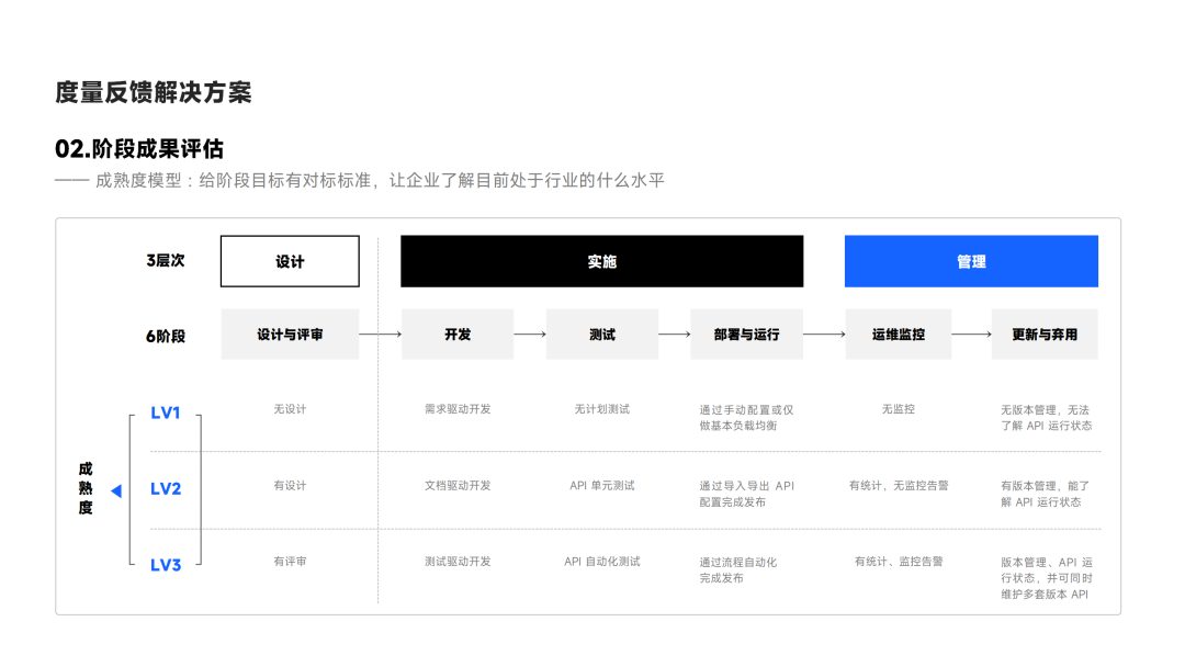 另外,我们提供了阶段性评估模型,不仅团队内部可以在不同时间段进行对比,也可以全面评估企业对于 API 全生命周期治理方面的水平。 这使得企业能够在未来的发展中更清晰地认识自身情况,以便进行有针对性的优化。