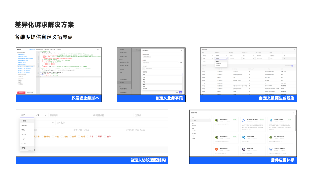 最后一个值得注意的实施难点是企业差异化诉求的解决方案。 不同企业的需求各异,需要我们在不同维度上提供多样清晰的拓展点,方便团队和企业内部自己动手制作一些小工具。我们强烈推崇在 DevOps 平台或 API 全生命周期管理平台上提供插件化体系,以支持其他额外功能的灵活插拔,使技术架构更加灵活。