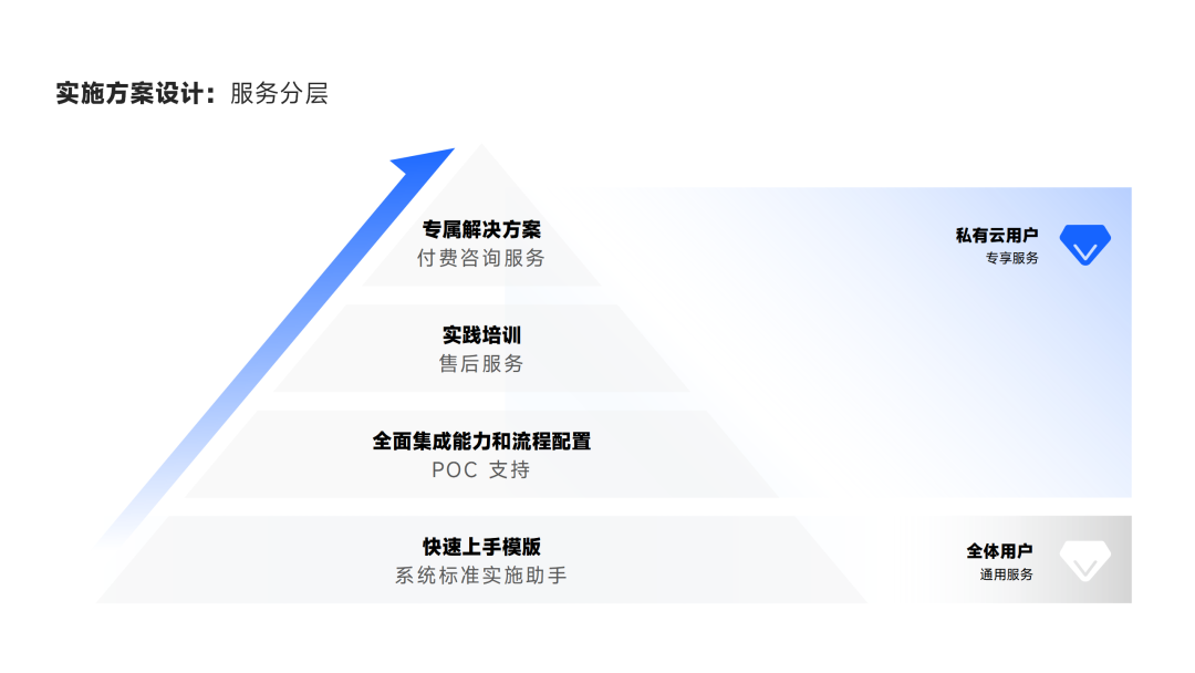 首先,我们需要了解这些实施难点的解决方案并不适用于所有的企业用户,只有快速上手模板是所有用户都能用得上。 对于一线员工和公有云企业用户而言,我们可以提供更普适的服务(如模板)来帮助其员工快速入门。