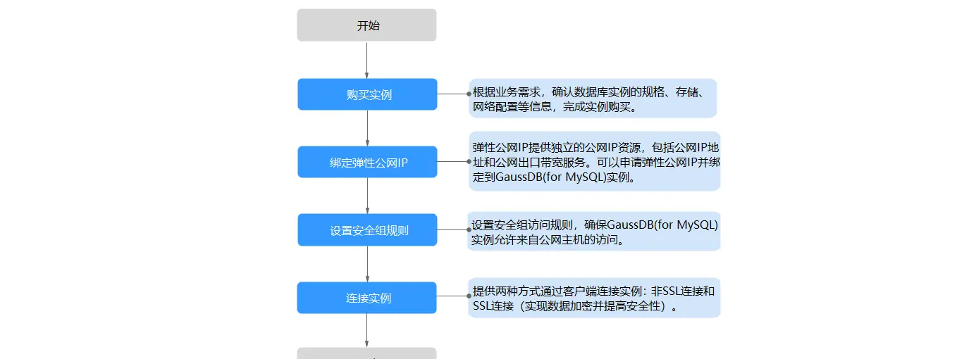 | 公网连接 | 弹性公网IP | 不能通过内网IP地址访问GaussDB(for MySQL)实例时,使用公网访问,建议单独绑定弹性公网IP连接弹性云服务器(或公网主机)与GaussDB(for MySQL)数据库实例。 | 降低安全性。为了获得更快的传输速率和更高的安全性,建议你将应用迁移到与你的GaussDB(for MySQL)实例在同一VPC内 ,使用内网连接。 |