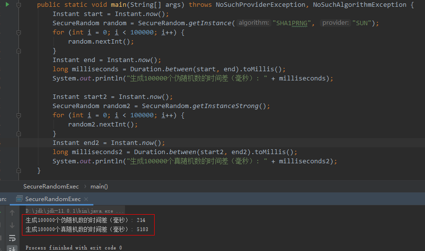 我们使用SHA1PRNG类型的随机数生成器,验证设置同样的种子seed后,是否能产生同样的随机数序列。