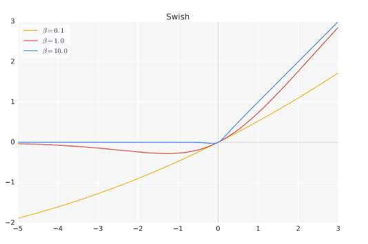 图1.2 Swish 激活函数在参数β 不同取值下的形状