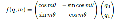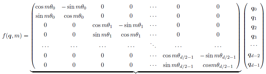 根据复数乘法的几何意义,上述变换实际上是对应向量旋转,所以位置向量称为“旋转式位置编码”。还可以使用矩阵形式表示: