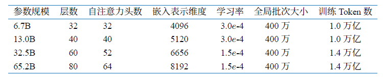 表1.3 LLaMA 不同模型规模下的具体超参数细节
