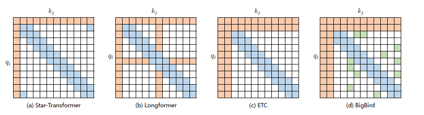现有的稀疏注意力机制,通常是基于上述五种基本基于位置的稀疏注意力机制的复合模式,图2.2给出了一些典型的稀疏注意力模型。Star-Transformer[54] 使用带状注意力和全局注意力的组合。具体来说,Star-Transformer 只包括一个全局注意力节点和宽度为3 的带状注意力,其中任意两个非相邻节点通过一个共享的全局注意力连接,而相邻节点则直接相连。Longformer使用带状注意力和内部全局节点注意力(Internal Global-node Attention)的组合。此外,Longformer 还将上层中的一些带状注意力头部替换为具有扩张窗口的注意力,在增加感受野同时并不增加计算量。Extended Transformer Construction(ETC)利用带状注意力和外部全局节点注意力(External Global-node Attention)的组合。ETC 稀疏注意力还包括一种掩码机制来处理结构化输入,并采用对比预测编码(Contrastive Predictive Coding,CPC)进行预训练。BigBird使用带状和全局注意力,还使用额外的随机注意力来近似全连接注意力,此外还揭示了稀疏编码器和稀疏解码器的使用可以模拟任何图灵机,这也在一定程度上解释了,为什么稀疏注意力模型可以取得较好的结果原因。