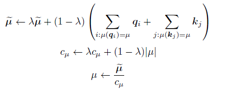 ,其中k 是类中心个数。每个Query 只与其处在相同簇(Cluster)下的Key 进行交互。中心向量采用滑动平均的方法进行更新: