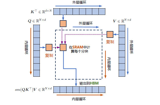 FlashAttention 算法并没有将S、P 整体写入全局内存,而是通过分块写入,存储前向传递的Softmax 归一化因子,在后向传播中快速重新计算片上注意力,这比从全局内容中读取中间注意力矩阵的标准方法更快。由于大幅度减少了全局内存的访问量,即使重新计算导致FLOPs 增加,但其运行速度更快并且使用更少的内存。具体算法如代码2.2所示,其中内循环和外循环所对应的计算可以参考下图。