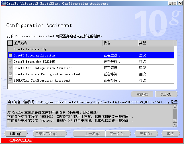 5. 上图完成后,进入了各种Oracle工具的安装阶段,包括网络配置向导,iSQL*plus等(后面课程中讲解)。如下图所示: