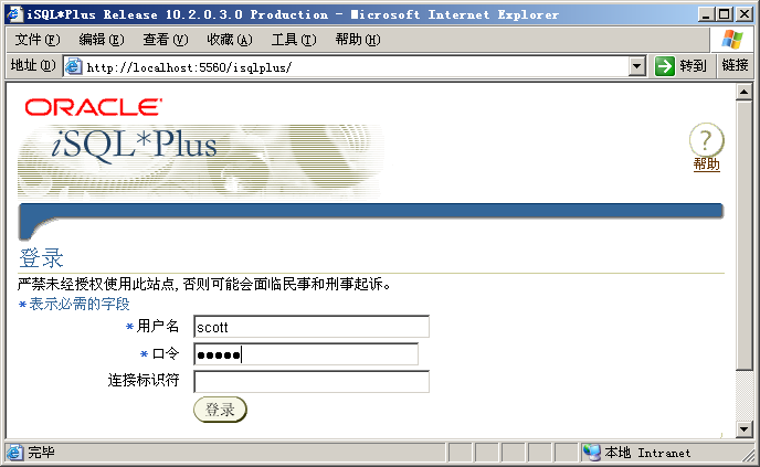 OracleOraDb10g_home1iSQL*Plus,该服务提供了用浏览器对数据库中数据操作的方式。该服务启动后,就可以使用浏览器进行远程登录并进行数据库操作了。如下图所示: