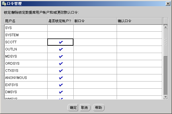 7. 数据库创建完毕后,需要设置数据库的默认用户。Oracle中为管理员预置了两个用户分别是SYS和SYSTEM。同时Oracle为程序测试提供了一个普通用户scott,口令管理中,可以对数据库用户设置密码,设置是否锁定。 Oracle客户端使用用户名和密码登录Oracle系统后才能对数据库操作。
