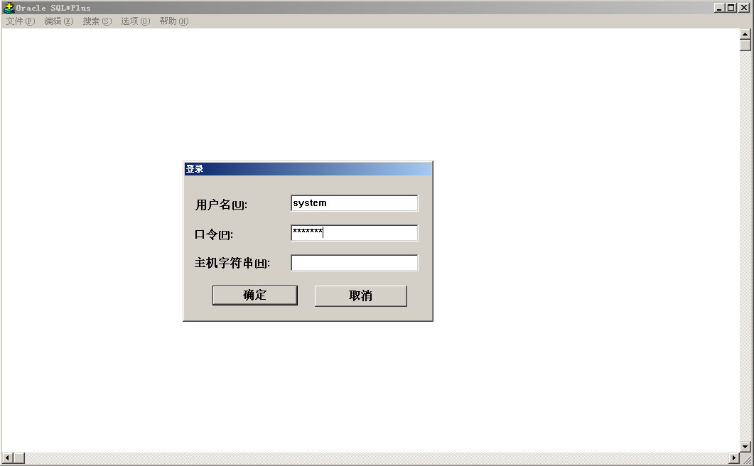 输入用户名和密码后,如果SQL*Plus与数据库服务器在同一台计算机上,并且当前服务器下只有一个数据库实例,那么“主机字符串”可以不用填写。