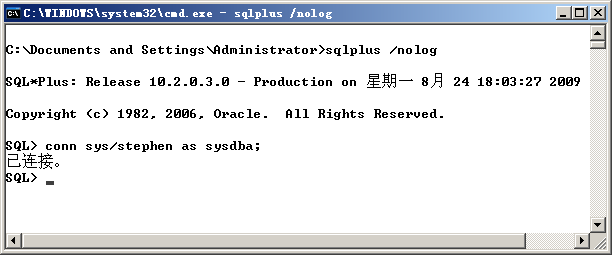 输入“sqlplus /nolog”命令后,只是启动了一个客户端进程,并没有与服务器连接,连接到Oracle服务器的命令是: