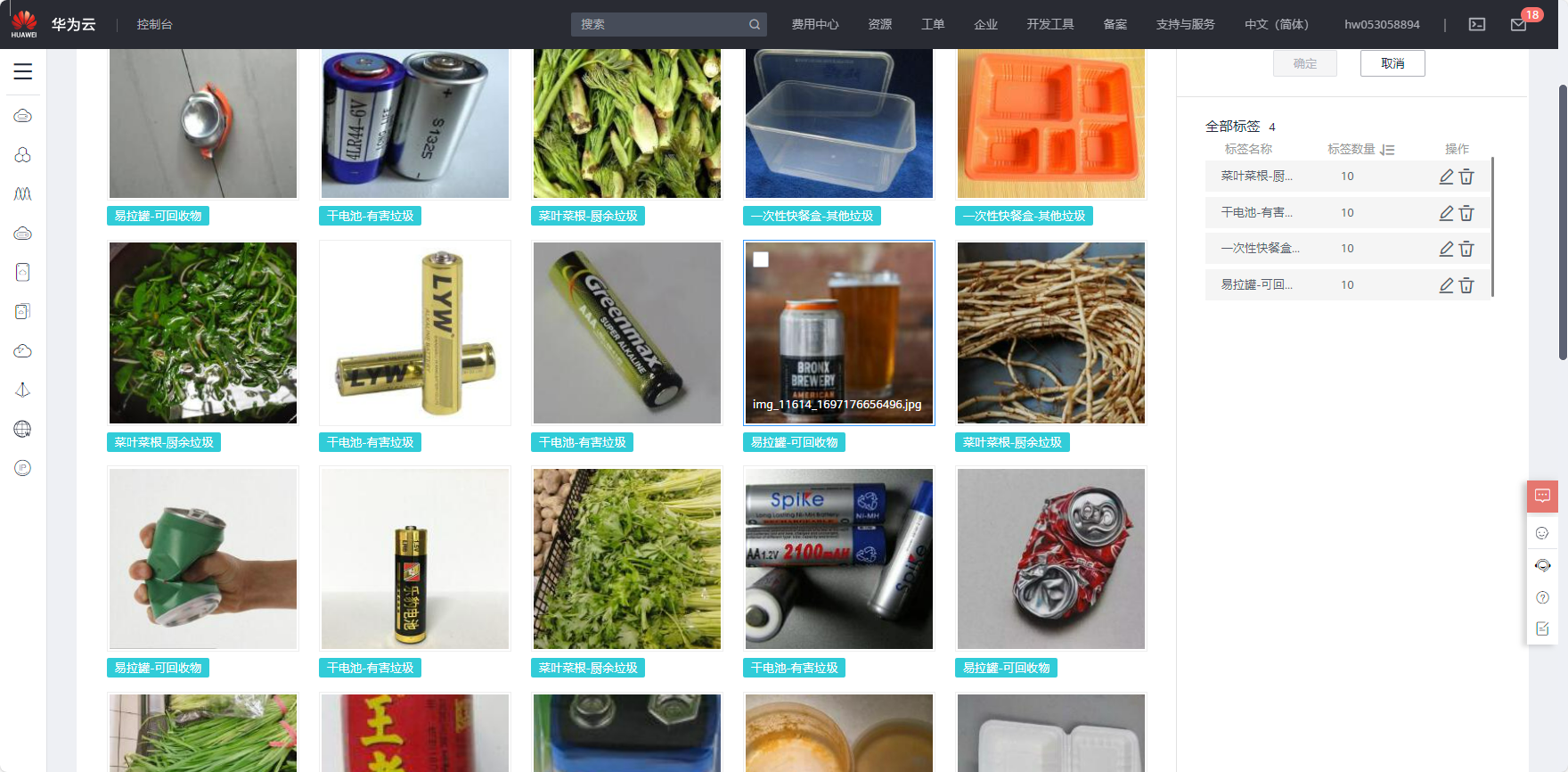 选择所有的一次性餐盒,然后在右边输入“一次性快餐盒-其他垃圾”,点击确定。同理,添加“易拉罐-可回收物”,“干电池-有害垃圾”,“菜叶菜根-厨余垃圾”三个标签。