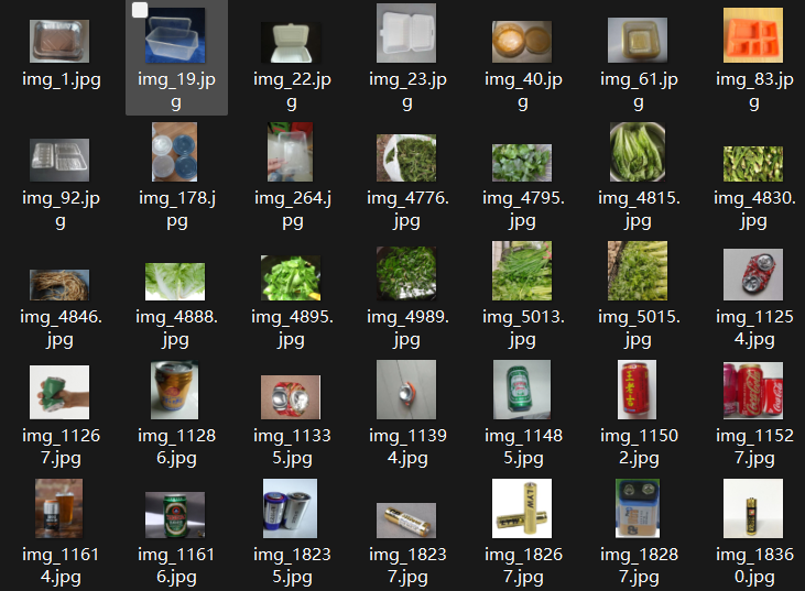 训练集:40张垃圾图片,包括可回收垃圾、其他垃圾、厨余垃圾、有害垃圾,每类各10张。