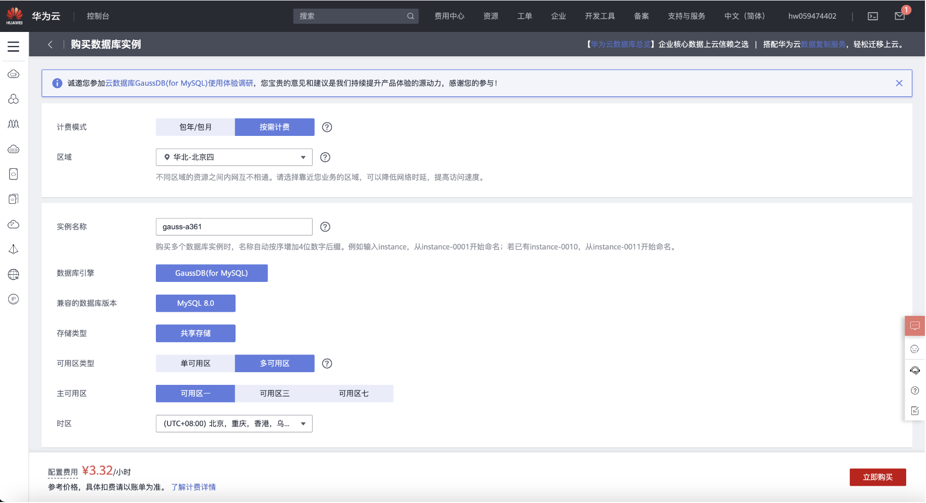 通过华为云GaussDB for MySQL平台进行数据库搭建。