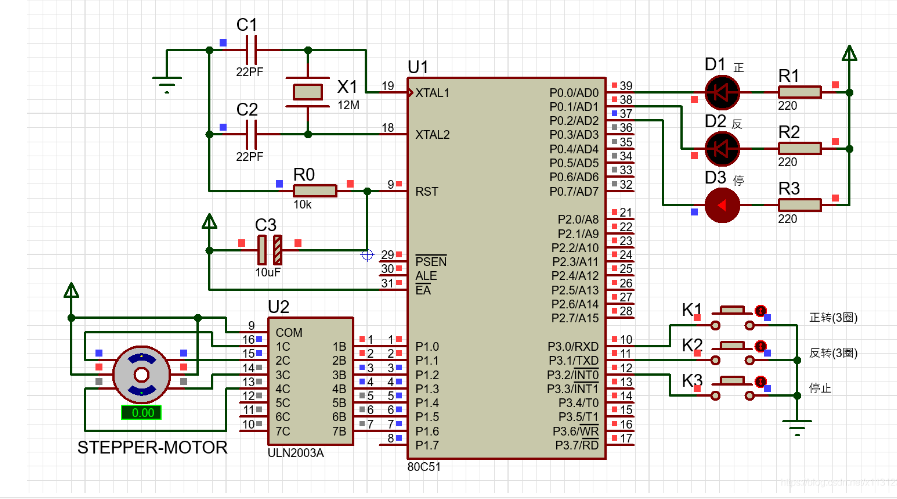 在以上代码中,增加了 cwBtn 和 ccwBtn 两个按键引脚,并定义为 P2^2 和 P2^3。按下顺时针按钮时,将 clockwiseDirection 设置为 1,表示启动方向为顺时针;按下逆时针按钮时,将 clockwiseDirection 设置为 0,表示启动方向为逆时针。