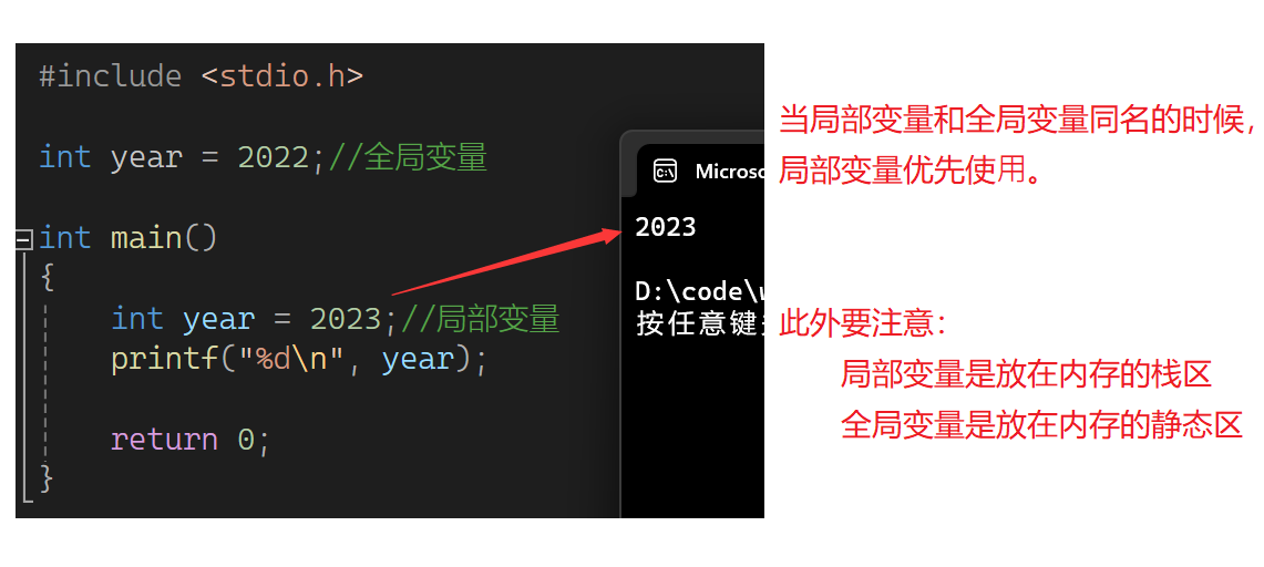 当全局变量与局部变量同名时,局部变量优先。