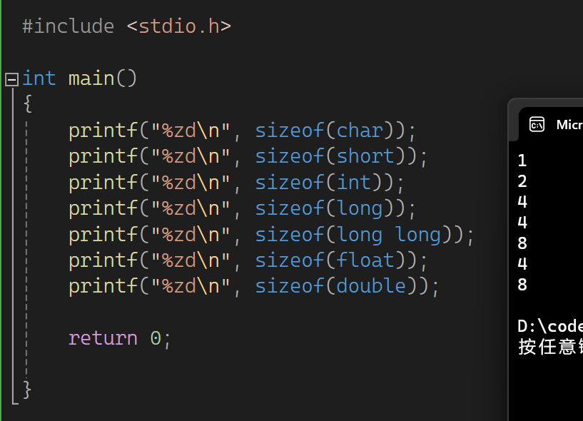 以上的每⼀种数据类型都有自己的长度,使用不同的数据类型,能够创建出长度不同的变量,变量长度的不同,存储的数据范围就有所差异。我们可以用sizeof操作符去查看。