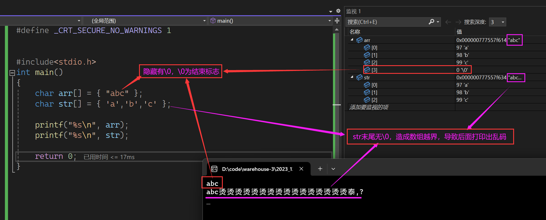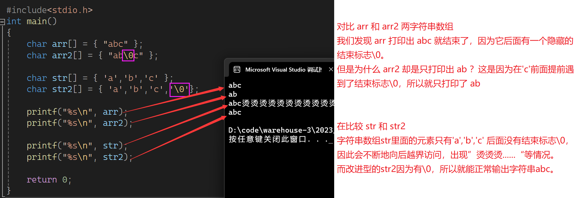 为了更清楚的了解结束标志\0的作用,我们在其中插入\0,看编译器的运行情况